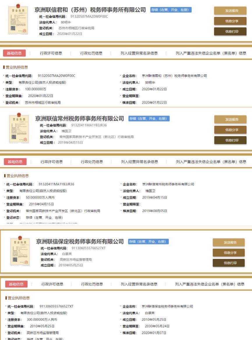 这三家事务所是江苏省常州市的京洲联信常州税务师事务所有限公司(简称常州公司);江苏省苏州市的京洲联信君和(苏州)税务师事务所有限公司(简称苏州公司);河北省保定市的京洲联信保定税务师事务所有限公司(原河北信安税务师事务所有限公司,简称保定公司)。
